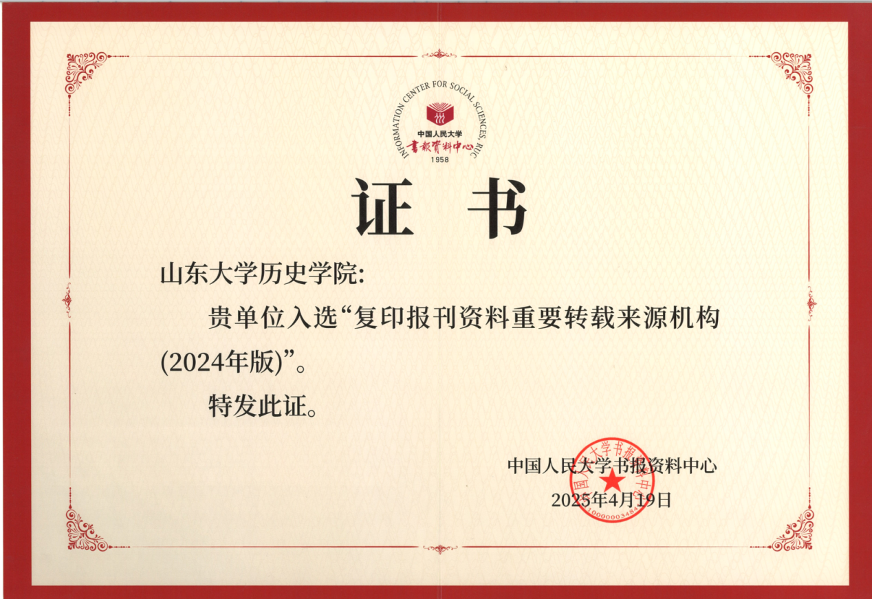 此次入選“復(fù)印報(bào)刊資料重要轉(zhuǎn)載來源機(jī)構(gòu)(2024年版)”,顯示出我院科研工作的良好成效。接下來,歷史學(xué)院將不斷強(qiáng)化科研工作,開展有組織的科研,促進(jìn)科研實(shí)力與學(xué)術(shù)影響力的雙重躍升,為進(jìn)一步推動學(xué)院高質(zhì)量發(fā)展注入強(qiáng)勁動能。