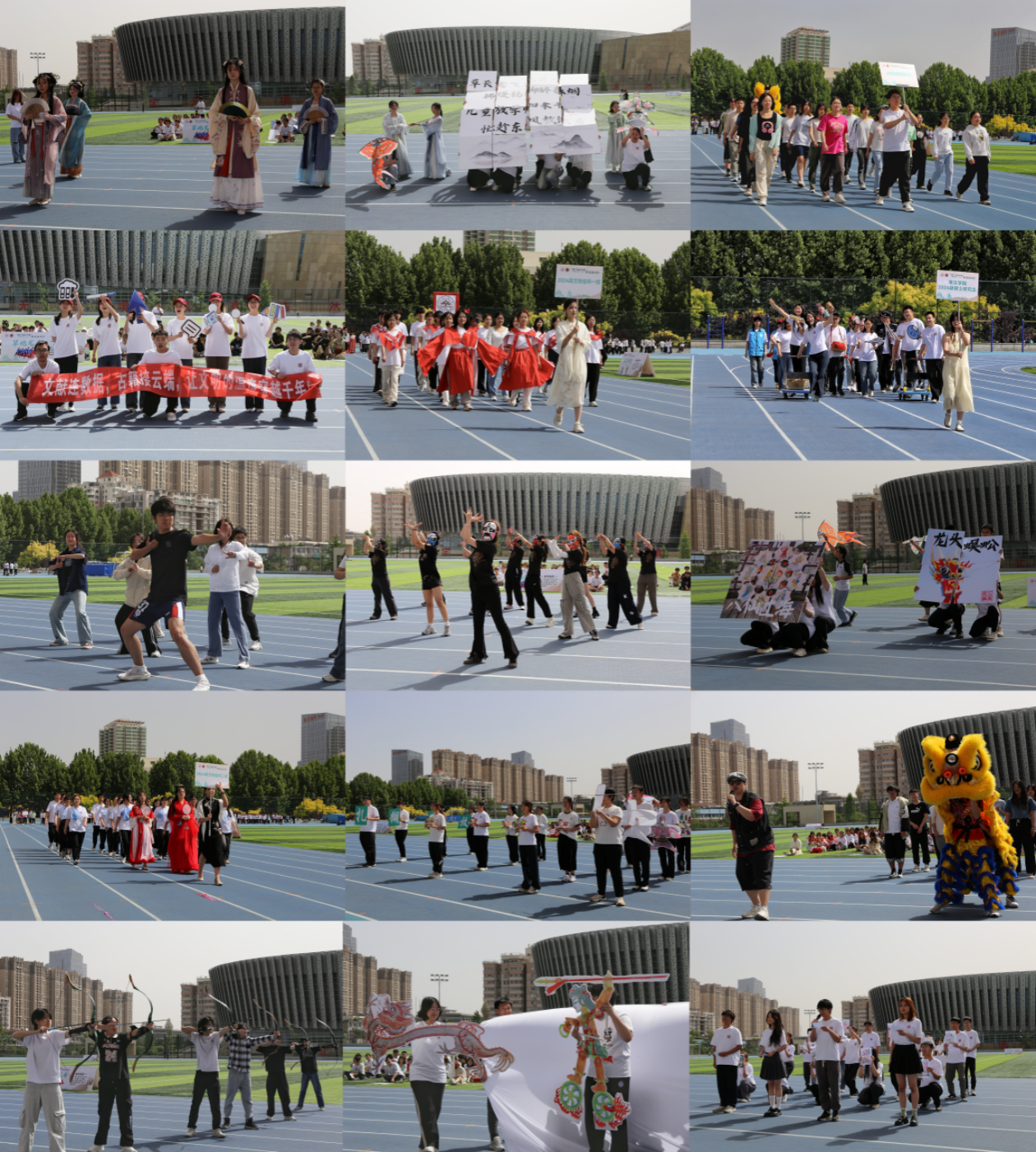 開幕式上,各班以非遺文化為核心元素編排的創(chuàng)意方陣依次亮相。風箏方陣以傳統(tǒng)風箏造型為載體,附以朗誦與舞蹈,展現傳統(tǒng)非遺文化的獨特魅力;武術方陣剛勁有力,詮釋中華武道精神;剪紙方陣通過巨型鏤空紙藝作品,呈現傳統(tǒng)技藝的精巧;扎染方陣以色彩斑斕的布料與服飾,展示傳統(tǒng)染色工藝魅力;年畫方陣融合傳統(tǒng)圖案與現代演繹,讓古老藝術煥發(fā)全新活力?!安┪镳^奇妙夜”以奇思妙想讓文物“活”起來,展現考古文博學生的活力與風采;漢服舞蹈以優(yōu)美典雅的身段與婉轉婀娜的身姿,展現跨越時空的東方美學意境。