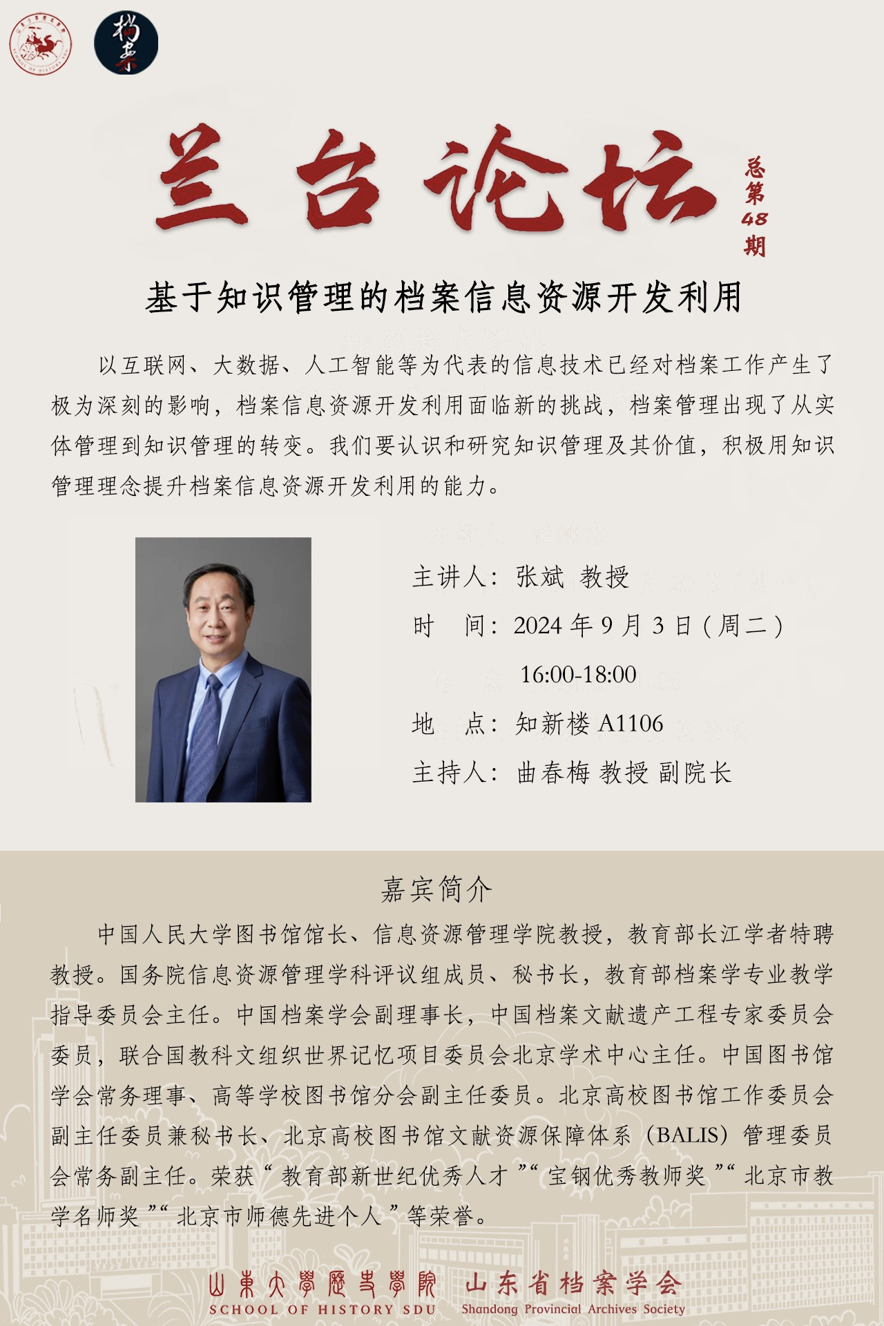 9月3日下午,中國(guó)人民大學(xué)圖書館館長(zhǎng)、信息資源管理學(xué)院教授、教育部檔案學(xué)專業(yè)教學(xué)指導(dǎo)委員會(huì)主任張斌教授作客“蘭臺(tái)論壇”,為我校師生作題為“基于知識(shí)管理的檔案信息資源開發(fā)利用”的專題學(xué)術(shù)報(bào)告。歷史學(xué)院副院長(zhǎng)曲春梅教授主持報(bào)告。