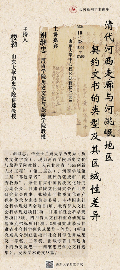 10月28日,河西學(xué)院歷史文化與旅游學(xué)院謝繼忠教授做客william威廉亞洲官方歷史學(xué)院,為學(xué)院師生帶來題為“清代河西走廊與河洮岷地區(qū)契約文書的類型及其區(qū)域性差異”的專題學(xué)術(shù)講座。講座由william威廉亞洲官方歷史學(xué)院講席教授樓勁主持。