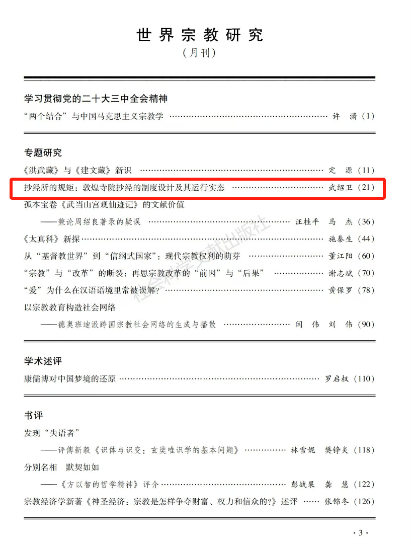 近日,我院副教授武紹衛(wèi)撰寫的《抄經(jīng)所的規(guī)矩:敦煌寺院抄經(jīng)的制度設(shè)計(jì)及其運(yùn)行實(shí)態(tài)》一文在《世界宗教研究》2024年第9期正式發(fā)表。