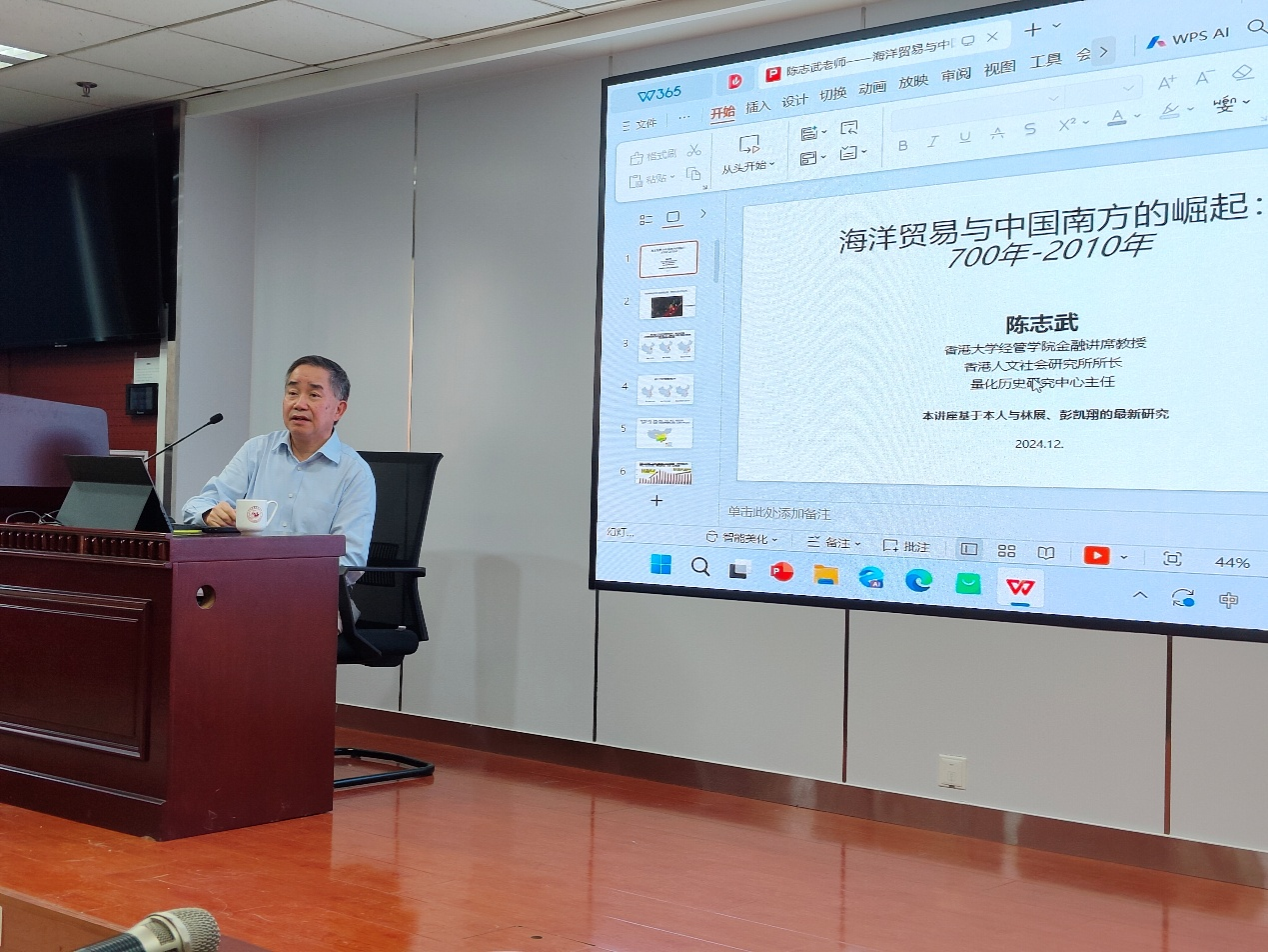 12月23日下午,香港大學(xué)經(jīng)管學(xué)院金融講席教授、香港大學(xué)香港人文與社會(huì)研究所所長(zhǎng)、香港大學(xué)量化歷史研究中心主任陳志武教授受邀為william威廉亞洲官方歷史學(xué)院師生進(jìn)行了題為《海洋貿(mào)易與中國(guó)南方的崛起(700年-2010年)》的精彩報(bào)告,講座在知新樓A1017舉行,由歷史學(xué)院院長(zhǎng)代國(guó)璽教授主持。