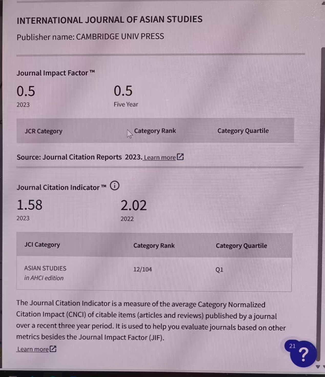 International Journal of Asian Studies是日本東京大學(xué)東洋文化研究所主辦的、國(guó)際亞洲研究學(xué)界知名的學(xué)術(shù)半年刊,由劍橋大學(xué)出版社出版。該刊為A&HCI一區(qū)收錄期刊,全年刊發(fā)研究性論文僅20篇上下。Web of Science2023年亞洲研究A&HCI/ESCI期刊排名:12/104.