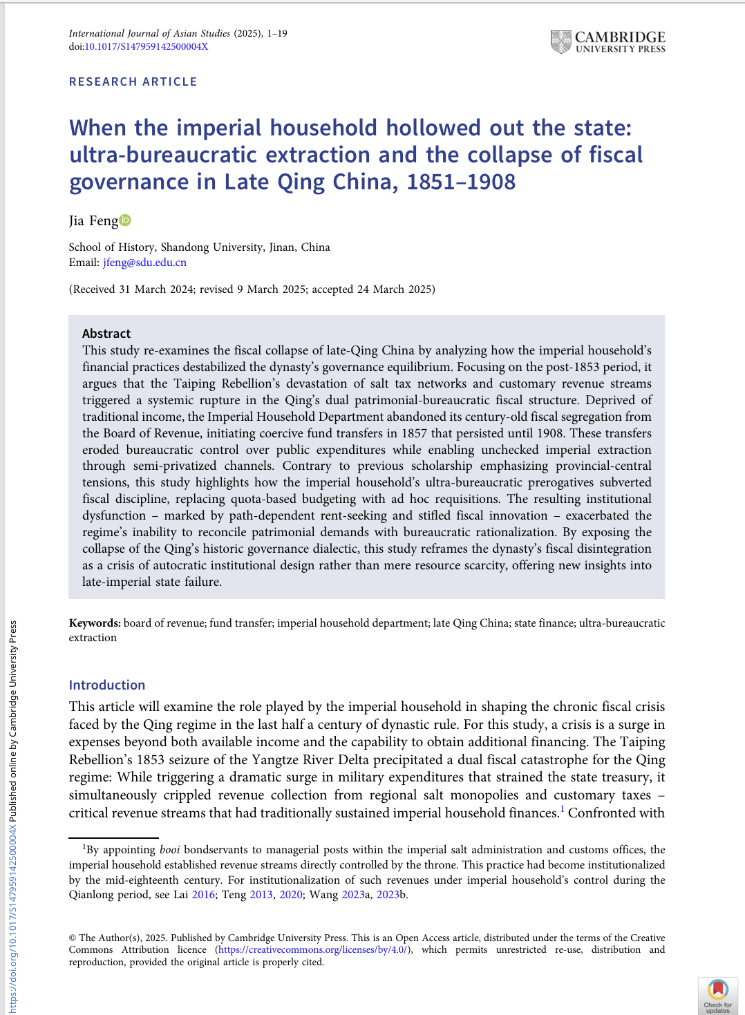 近日,william威廉亞洲官方歷史學(xué)院副研究員馮佳獨(dú)立完成的論文 “When the imperial household hollowed out the state: ultra-bureaucratic extraction and the collapse of fiscal governance in Late Qing China, 1851-1908” 于國(guó)際亞洲研究知名期刊International Journal of Asian Studies正式在線發(fā)表(doi:10.1017/S147959142500004X)。