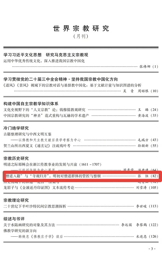 近日,我院張恒副教授在《世界宗教研究》2025年第5期發(fā)表題為《“僧道入籍”與“寺觀歸并”:明初對僧道群體的管控與整頓》的專題論文,全文約1.5萬字。