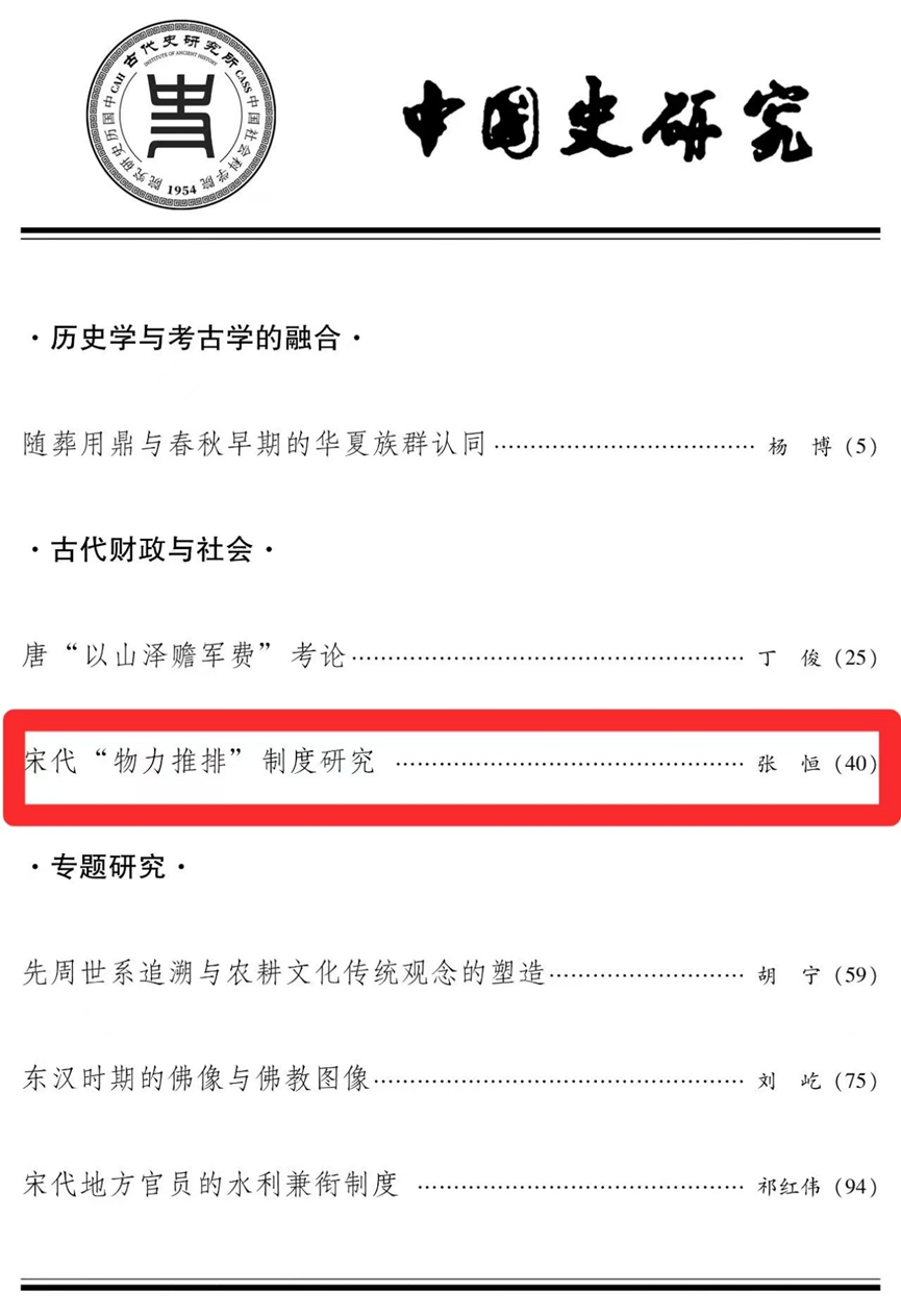 近日,我院張恒副教授在《中國史研究》2025年第3期發(fā)表題為《宋代“物力推排”制度研究》的專題論文,全文約2.3萬字。