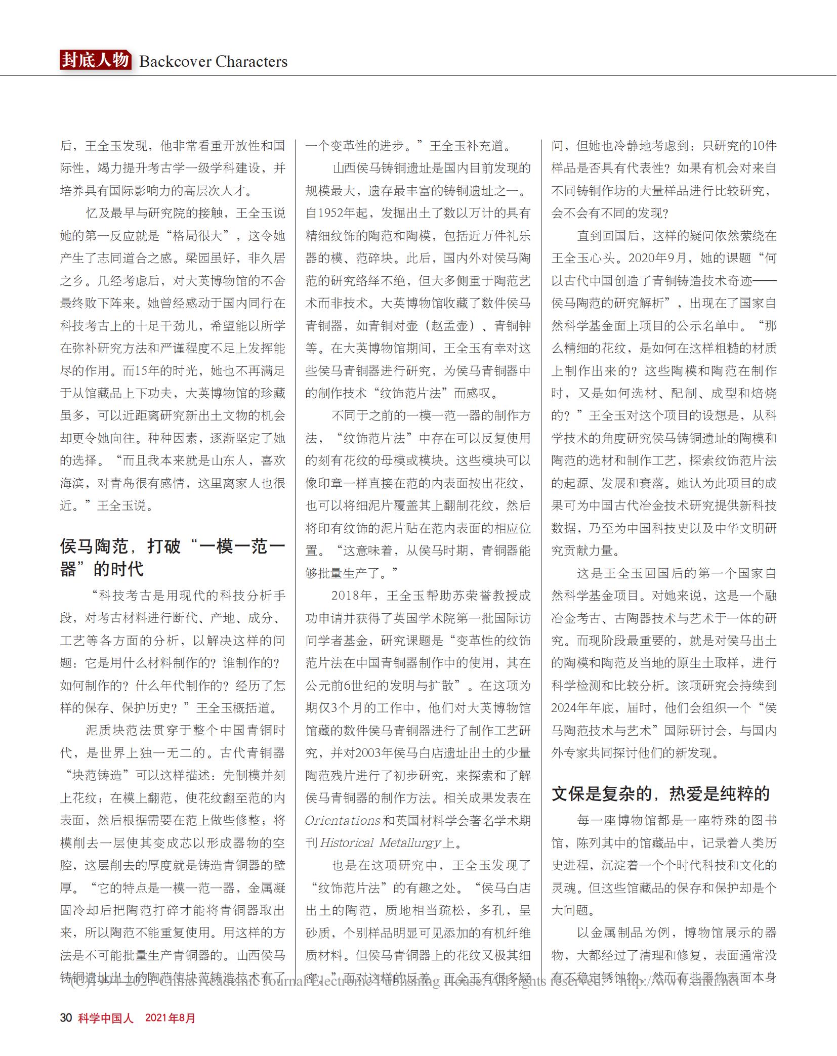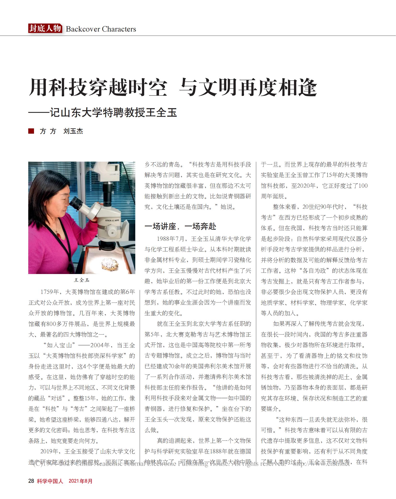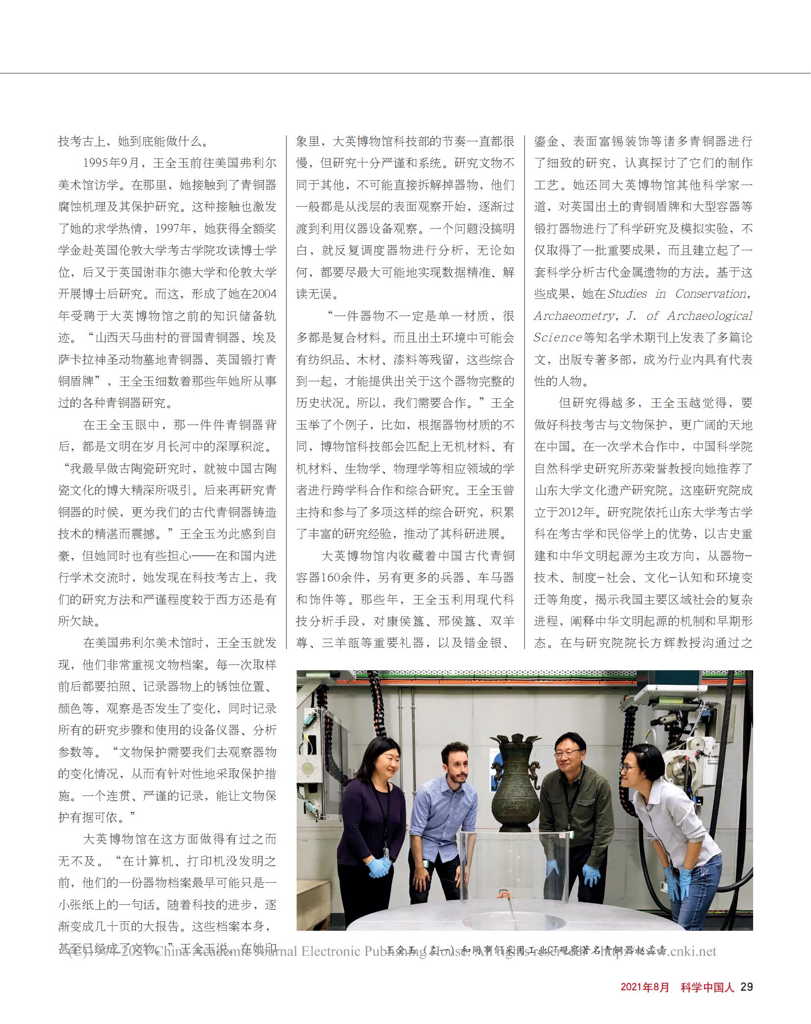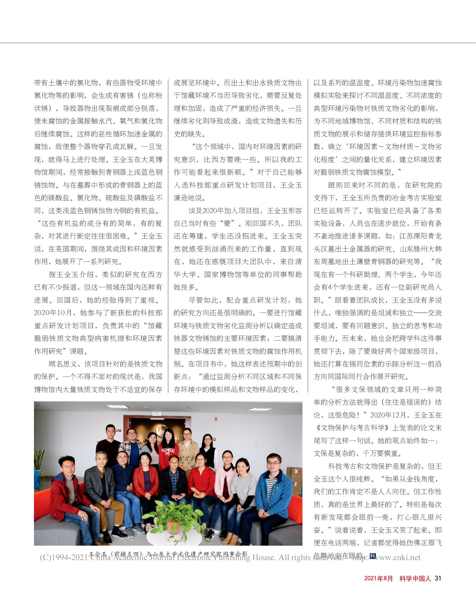 “很多文保領域的文章只用一種簡單的分析方法就得出(往往是錯誤的)結論,這很危險!”2020年12月,王全玉在《文物保護與考古科學》上發(fā)表的論文末尾寫了這樣一句話。她的觀點始終如一:文保是復雜的,千萬要慎重。科技考古和文物保護是復雜的,但王全玉這個人很純粹?!叭绻麖慕疱X角度,我們的工作肯定不是人人向往。但工作性質,真的是世界上最好的了。特別是每次有新發(fā)現(xiàn)都會眼前一亮,打心眼兒里興奮。”說著說著,王全玉又笑了起來。即便在電話兩端,記者都覺得她仿佛正眉飛色舞地坐在眼前。