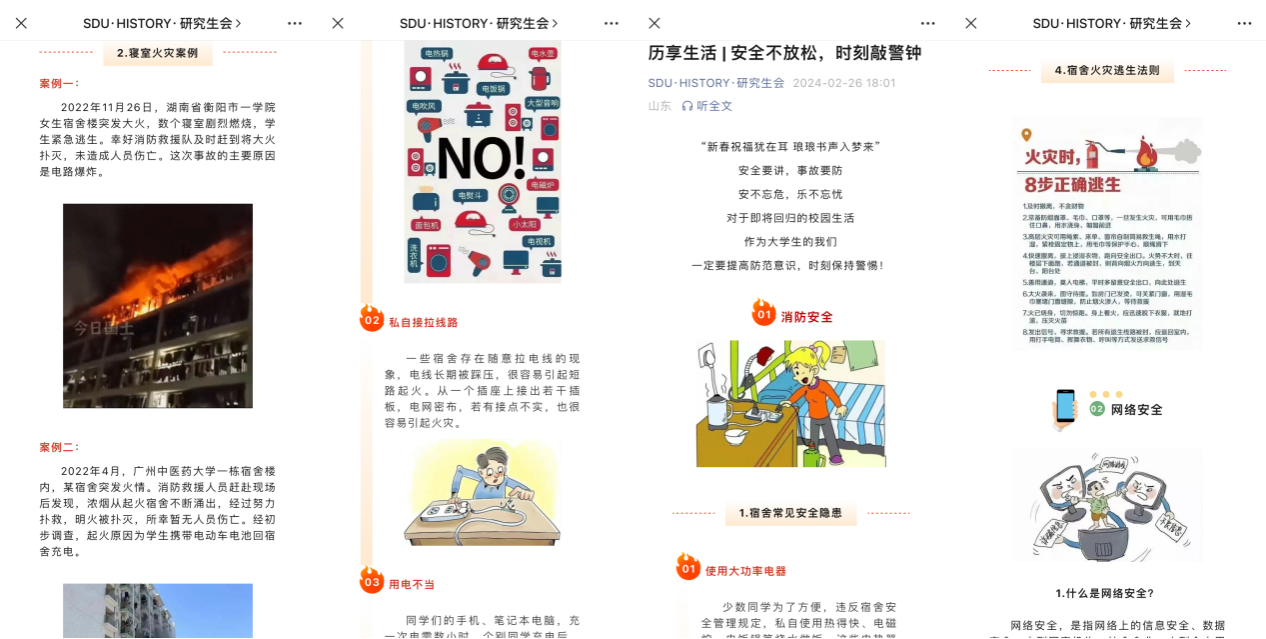 學(xué)院通過研究生會微信公眾號發(fā)布“安全不放松,時刻敲警鐘”主題推文,包含消防安全、網(wǎng)絡(luò)安全、交通安全、食品安全等內(nèi)容,配以相關(guān)案例和圖片,提醒學(xué)生做好自身安全“第一責(zé)任人”,加強自我防范意識,提高安全保護能力,營造健康向上的新學(xué)期氛圍。