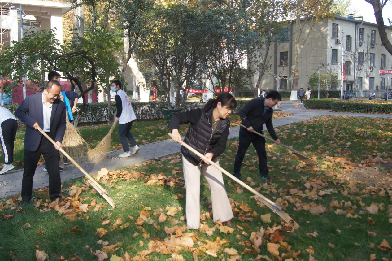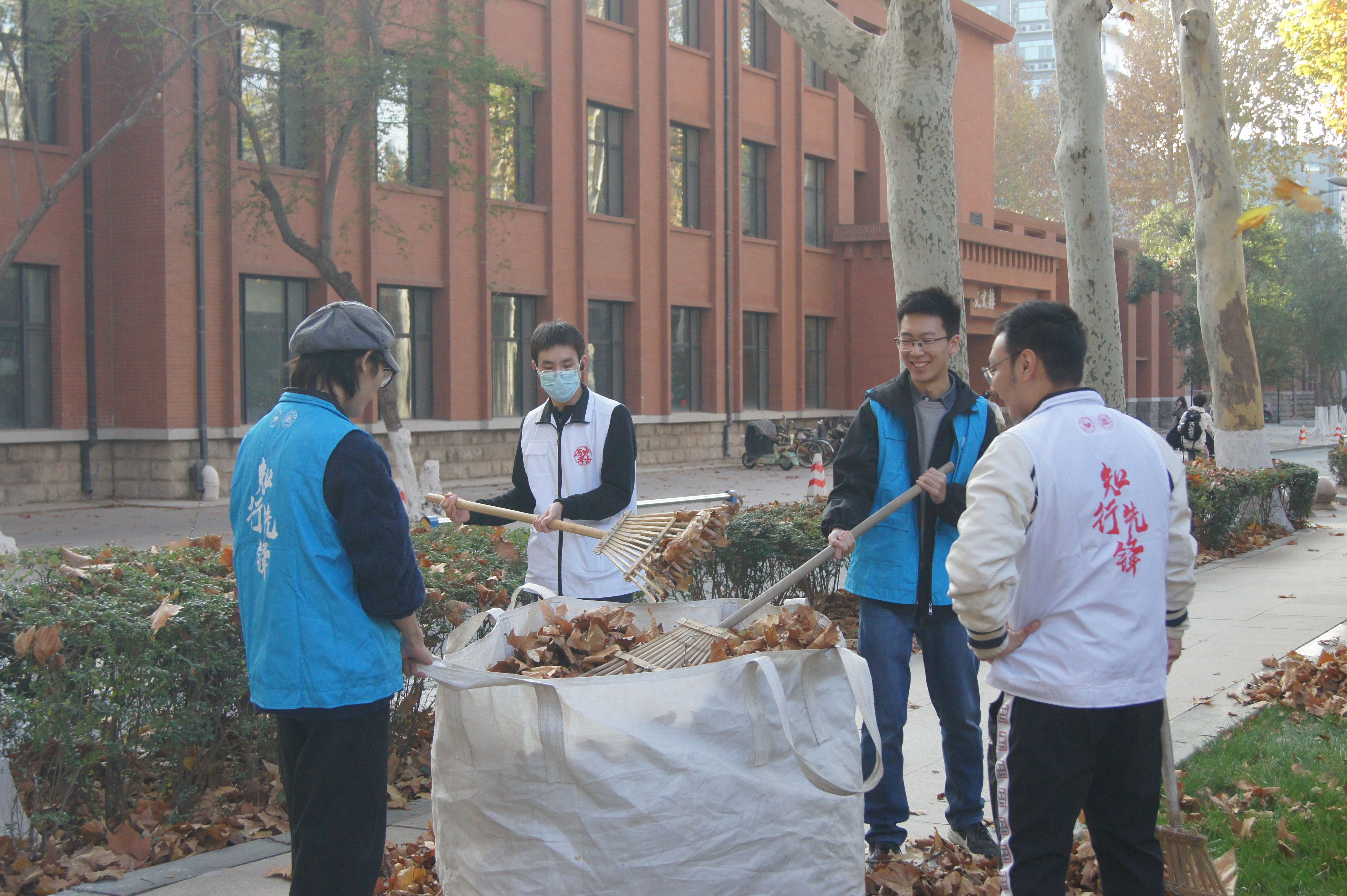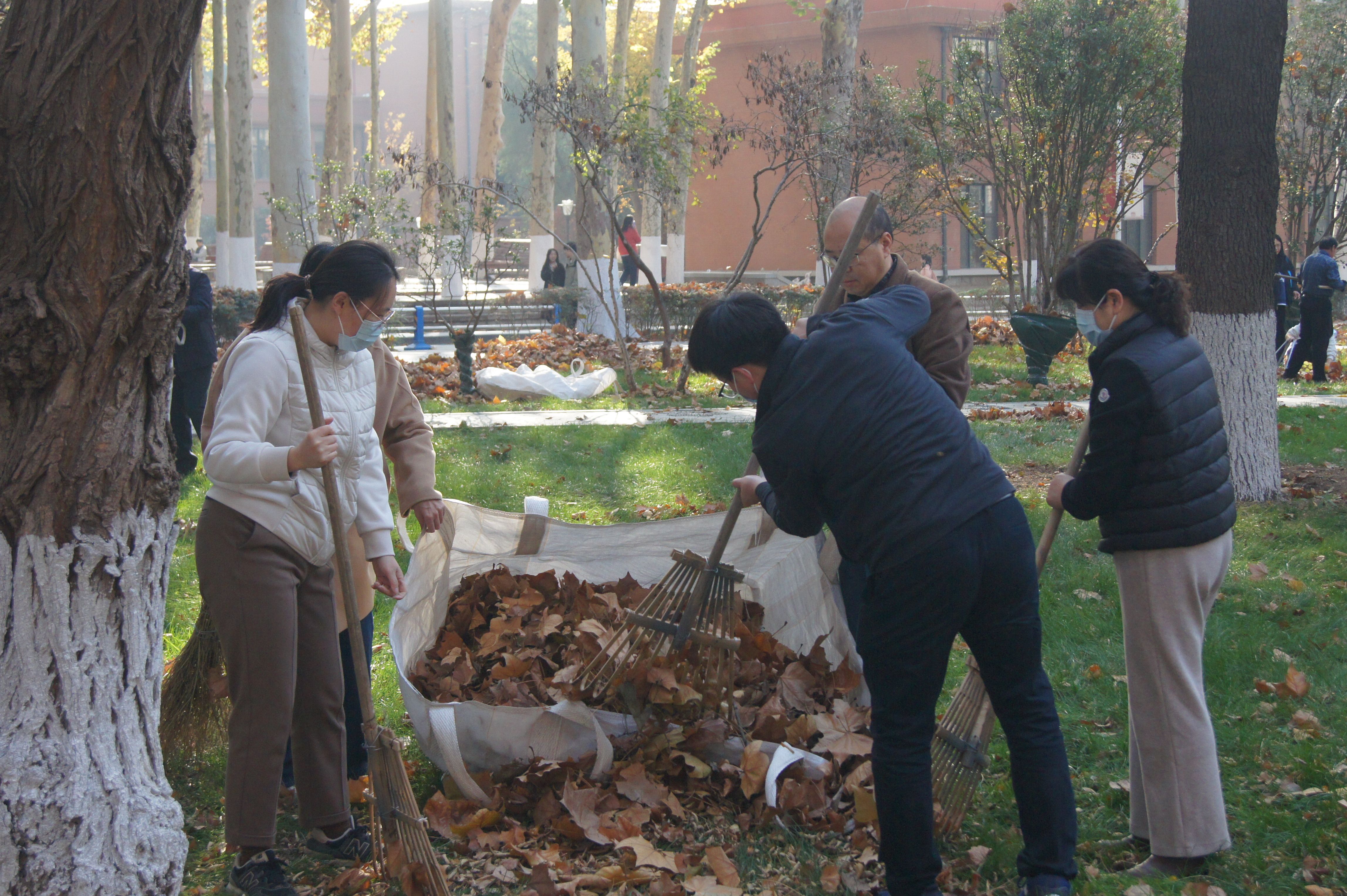 本次活動以歷史學(xué)院“八馬同槽”雕像為中心,集中清掃了從文史樓到學(xué)生公寓3號樓中間區(qū)域的落葉。同學(xué)們身穿“知行先鋒”馬甲與后勤保障部老師們分工合作,積極勞動。營造出師生黨員和青年志愿者們“服務(wù)在校園,奉獻(xiàn)雙崗位”的濃厚氛圍。