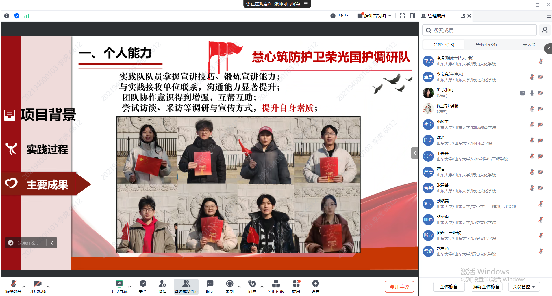 活動(dòng)中,來(lái)自一校三地不同學(xué)院、專(zhuān)業(yè)的負(fù)責(zé)同學(xué)通過(guò)線上平臺(tái)依次展示了實(shí)踐過(guò)程、實(shí)踐成果、實(shí)踐展望等內(nèi)容。他們完成問(wèn)卷調(diào)查、開(kāi)展訪談和走訪調(diào)研,查閱海量資料、深入各地多個(gè)育人場(chǎng)館、組織多形式宣講,聚焦國(guó)家安全專(zhuān)題,深刻闡述國(guó)家安全的重要性,深入挖掘開(kāi)展國(guó)家安全教育對(duì)當(dāng)代大學(xué)生成長(zhǎng)發(fā)展的重要意義。