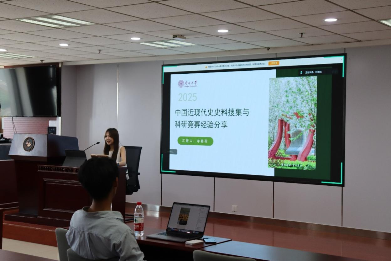 南開大學牟嘉荷同學以“中國近現(xiàn)代史史料搜集與科研競賽經(jīng)驗分享”為主題,從研究方向的確定、如何獲取史料、本科期間的競賽以及其他建議四個方面展開介紹。她鼓勵本科生“打破對自己的限制,在多元嘗試中錨定興趣”,詳細介紹了檔案館查檔技巧、數(shù)據(jù)庫檢索方法及口述史競賽經(jīng)驗,提供了寶貴的近代史史料檢索經(jīng)驗。最后也強調(diào)本科生需要找到合適的放松方式,保持身心健康很重要。