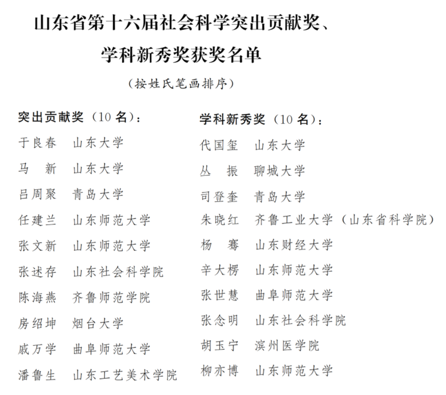 近日,山東省人民政府公布了山東省第十六屆社會(huì)科學(xué)突出貢獻(xiàn)獎(jiǎng)、學(xué)科新秀獎(jiǎng)獲獎(jiǎng)人員名單,學(xué)院馬新教授榮獲突出貢獻(xiàn)獎(jiǎng),代國(guó)璽教授榮獲學(xué)科新秀獎(jiǎng)。 山東省社會(huì)科學(xué)突出貢獻(xiàn)獎(jiǎng)和學(xué)科新秀獎(jiǎng),是省政府頒發(fā)的社會(huì)科學(xué)...