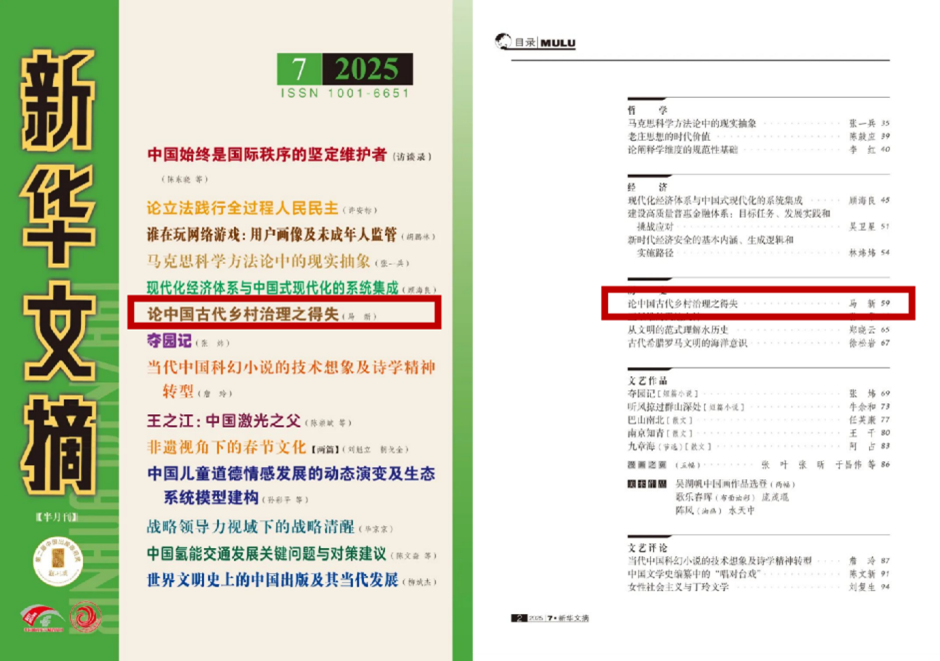 我院馬新教授論文《論中國古代鄉(xiāng)村治理之得失》被《新華文摘》2025年第7期主體轉載,并列入封面要目。《論中國古代鄉(xiāng)村治理之得失》原發(fā)于《理論學刊》2025年第1期。文章立足中國式話語體系,集中反思了中國古代鄉(xiāng)村治理中的諸問題,提出:在中國古代鄉(xiāng)村治理問題上,王朝政權始終是主角。無論鄉(xiāng)里體系,還是戶籍管理;無論是教化、宗教信仰,還是宗族政策,都處于王朝政權的直接主導下,這是由中國古代農(nóng)耕文明發(fā)展道路與大一...